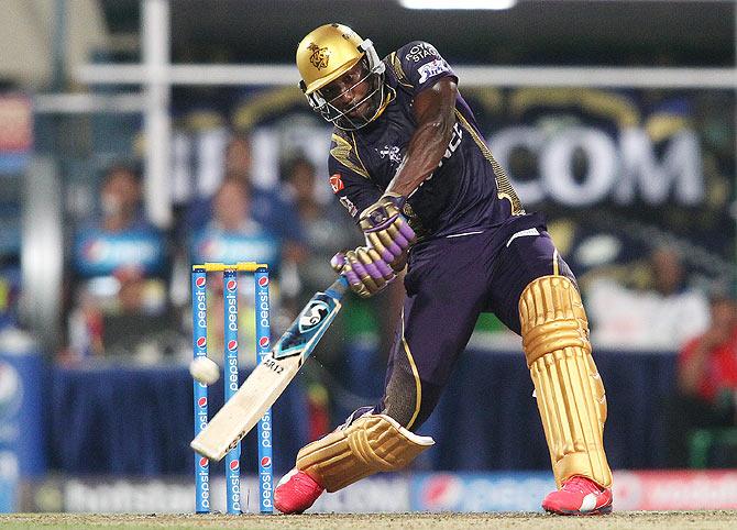 Two sixes and a boundary by Andre Russell of Shamsi. Russell is on fire here at Bengaluru.