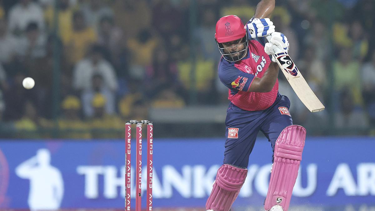 Six! Samson hits the tossed up delivery uppishly and ball sails over the long-off boundary for a maximum.