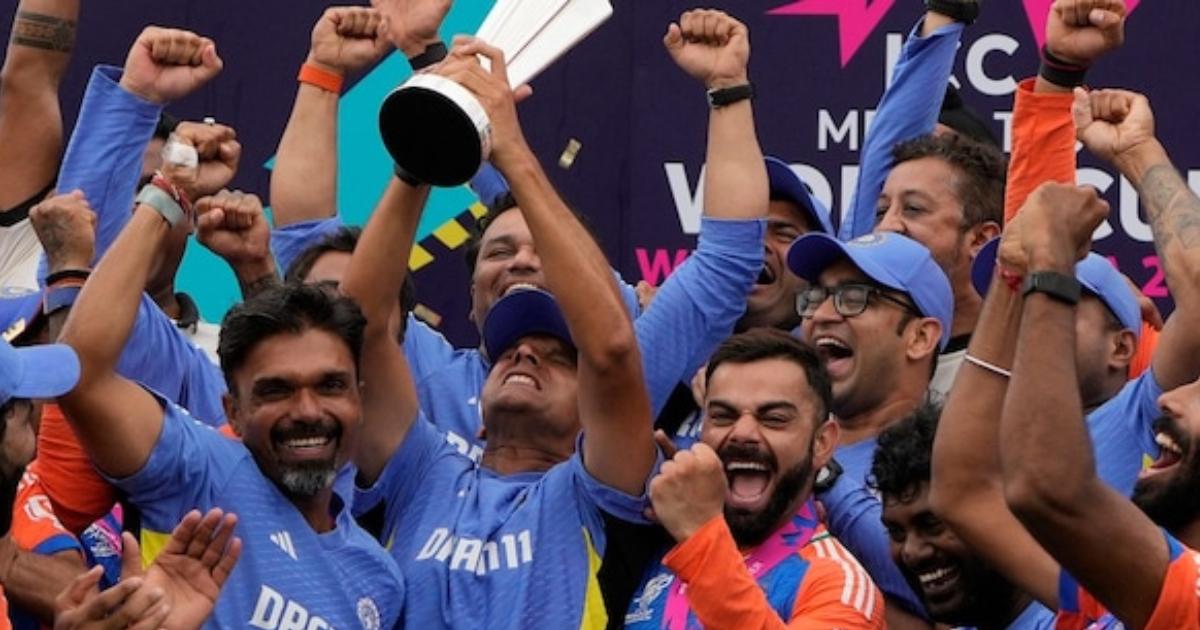 After India pipped South Africa in a tense final to win their second T20 World Cup, in a rare display of emotion, former coach Dravid was seen letting out a roar while holding the trophy aloft.