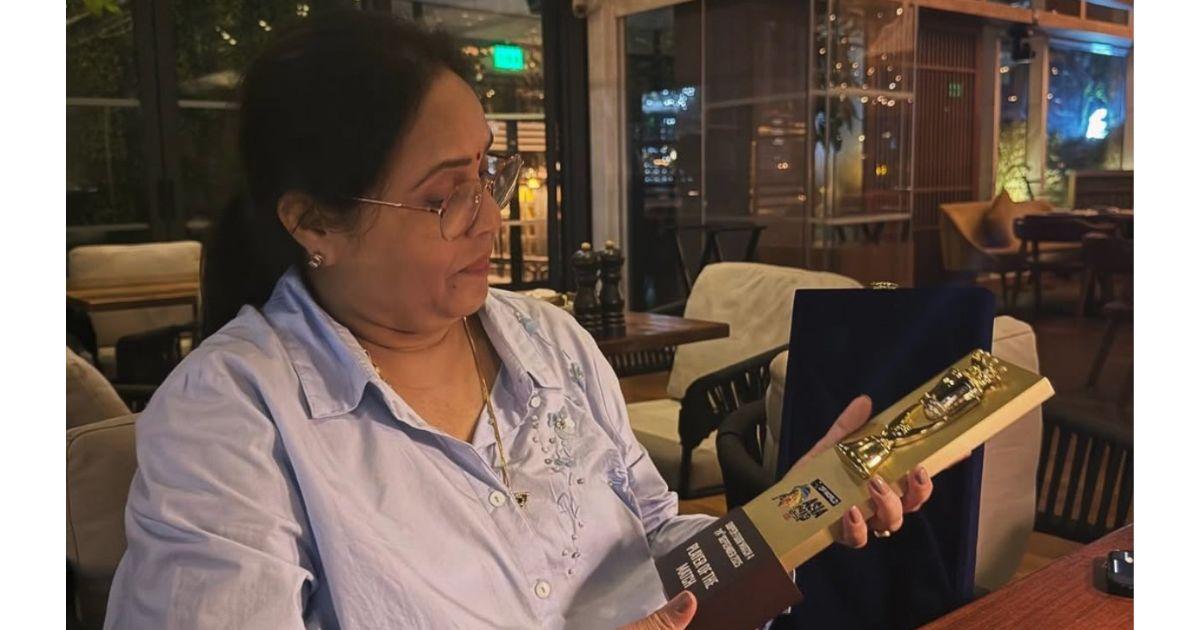 After the match, he met up with his family members over dinner and showed his mother Manju Sharma, his Player of the Match Award.