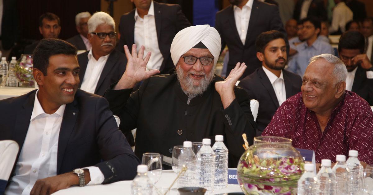 IMAGE: Bishan Singh Bedi with Ravichandran Ashwin and Erapalli Prasanna during the BCCI Annual Awards in Bengaluru on March 8, 2017. Photograph: BCCI