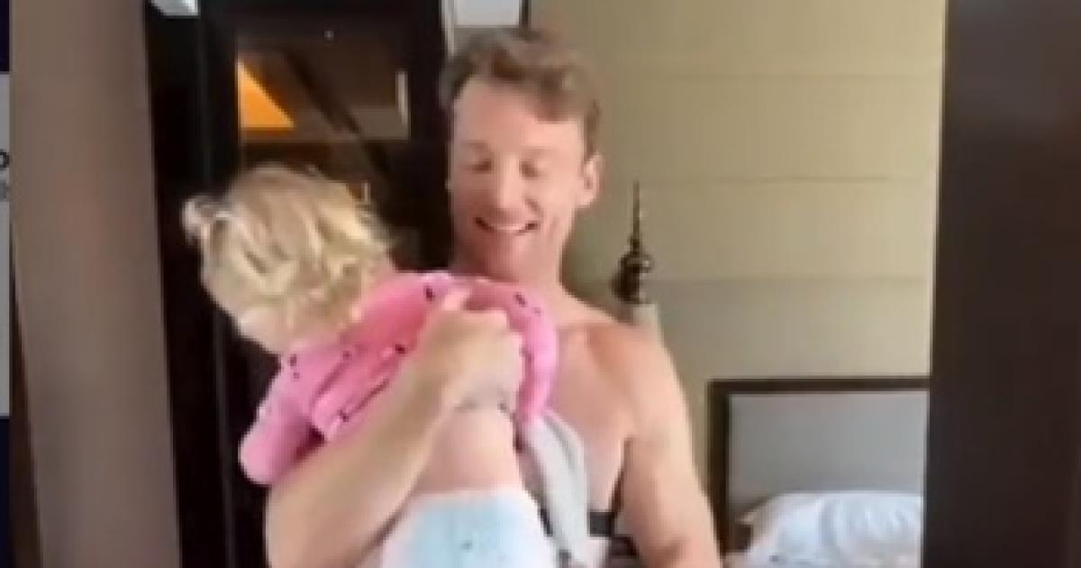 The video shows Buttler holding Georgia while doing sit-ups. Daughter and dad are also seen doing push-ups and other exercises.