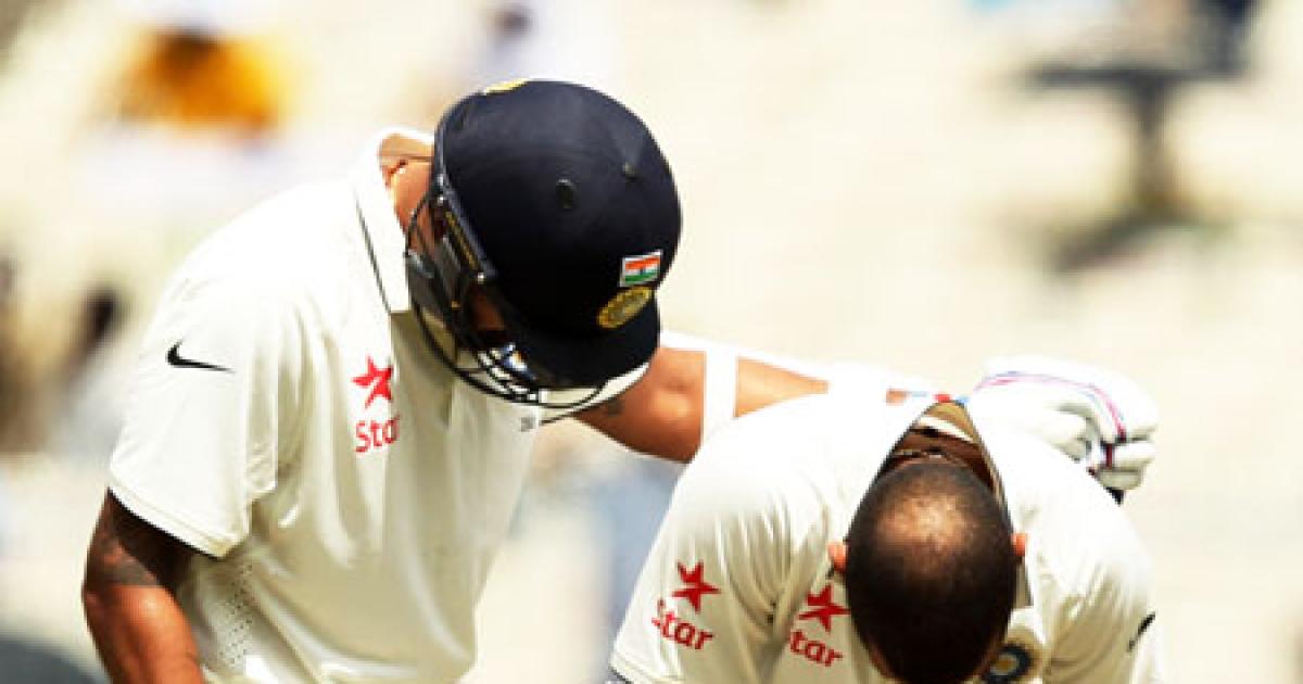 Image: Shikhar Dhawan (right) is comforted by teammate Rohit Sharma after getting hit on the thumb, on Day 3 of the 2nd Test in Kolkata on Sunday