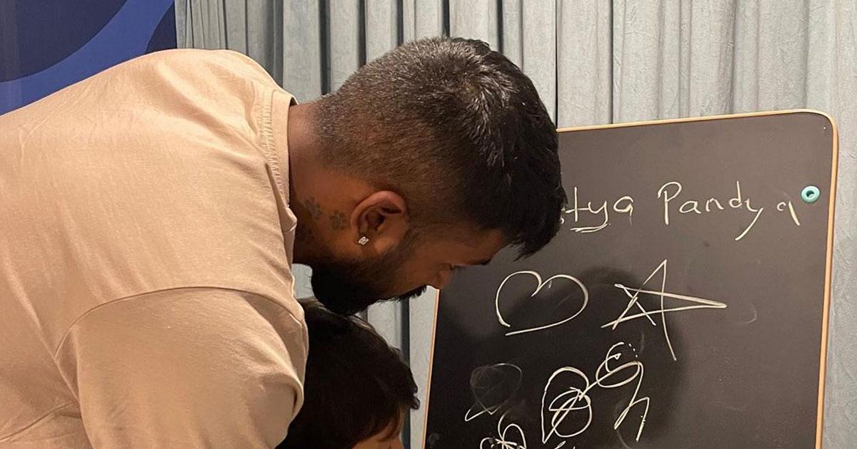 Hardik was back to daddy duties as helped his son Agastya, who turned 2 on July 30, with some writing lessons on the blackboard.