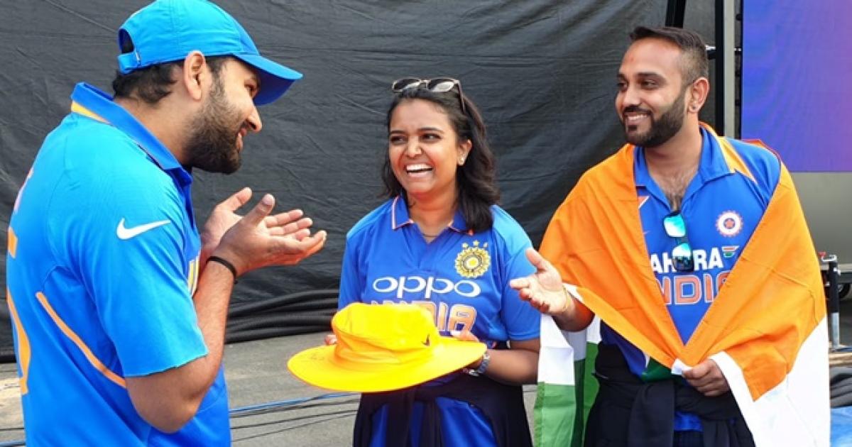 India opening batsman Rohit Sharma presented an autographed hat to a fan named Meena, who was hit by the ball during team's match against Bangladesh in the ongoing ICC Cricket World Cup at Edgbaston, in Birmingham, on Tuesday.