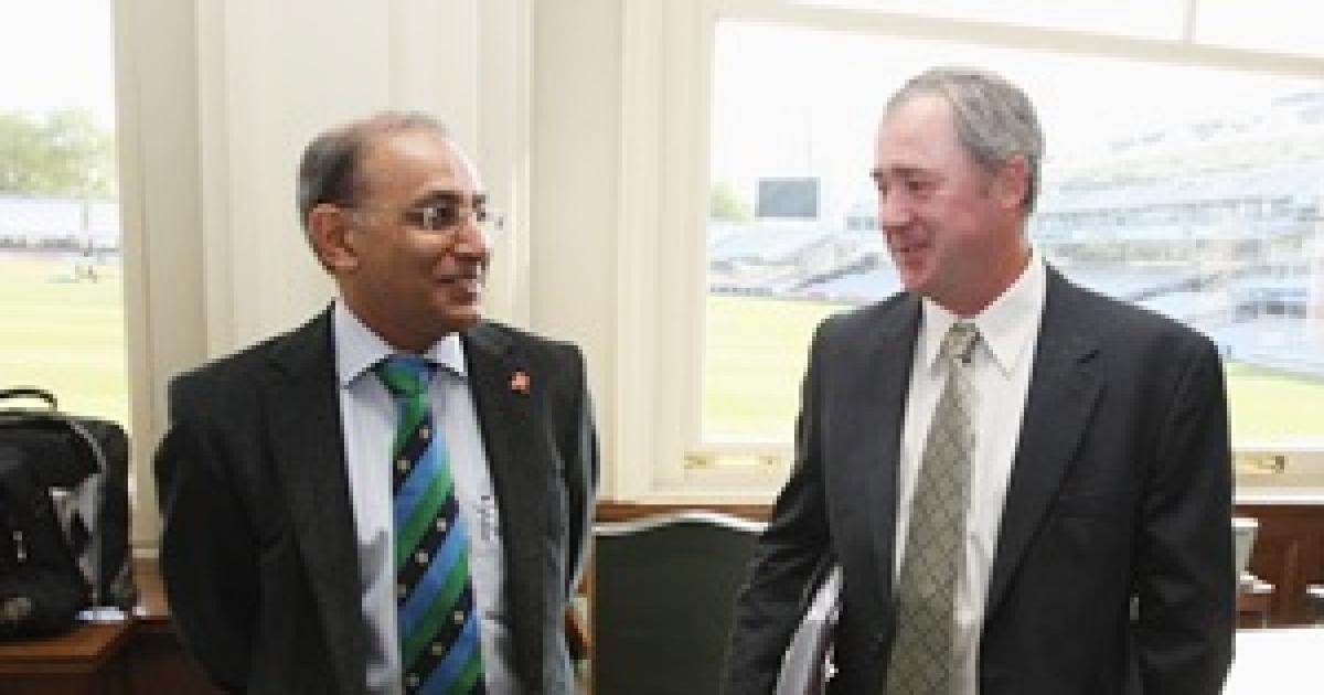 Image: Haroon Lorgat, former ICC Chief Executive, and Tim May, Chief Executive of the Federation of International Cricketers' Associations, during the ICC Committee meeting at Lord’s on May 11, 2009 in London.