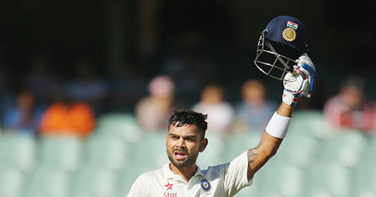Virat Kohli became only the third Indian to score a hundred on captaincy debut as the visitors responded resolutely to Australia's mammoth first innings total by posting 369 for 5 on the third day to leave the first Test evenly poised at the Adelaide Oval on Thursday.