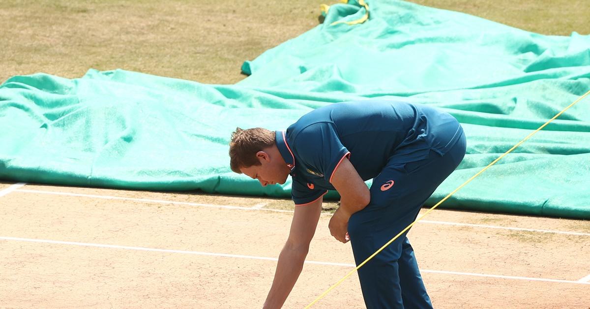 IMAGE: Australia’s Steve Smith inspects the pitch prior to their training session at the Holkar Stadium in Indore. Photograph: Robert Cianflone/Getty Images
