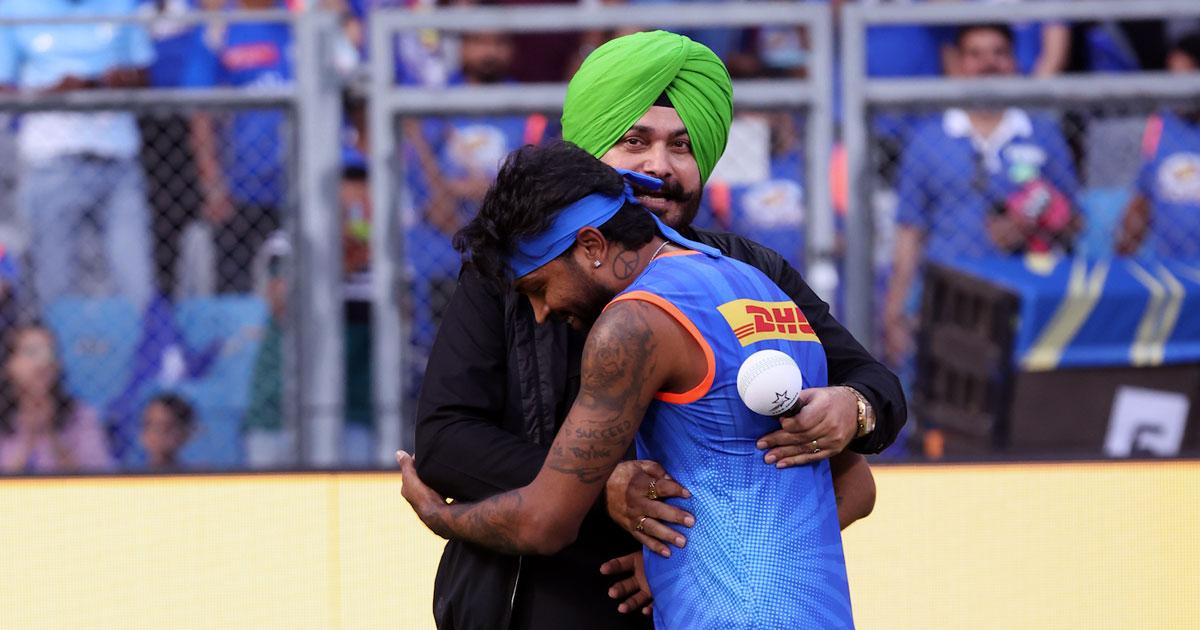 Commentators Navjot Singh Sidhu and Harbhajan Singh comforted Hardik as they hugged the MI skipper while doing their pre-match show ahead of the game.