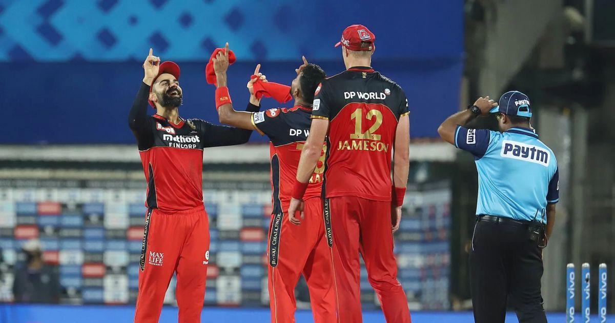 IMAGE: Royal Challengers Bangalore players celebrate the win against Kolkata Knight Riders in Chennai, April 18, 2021. Photograph: Faheem Hussain/Sportzpics for IPL