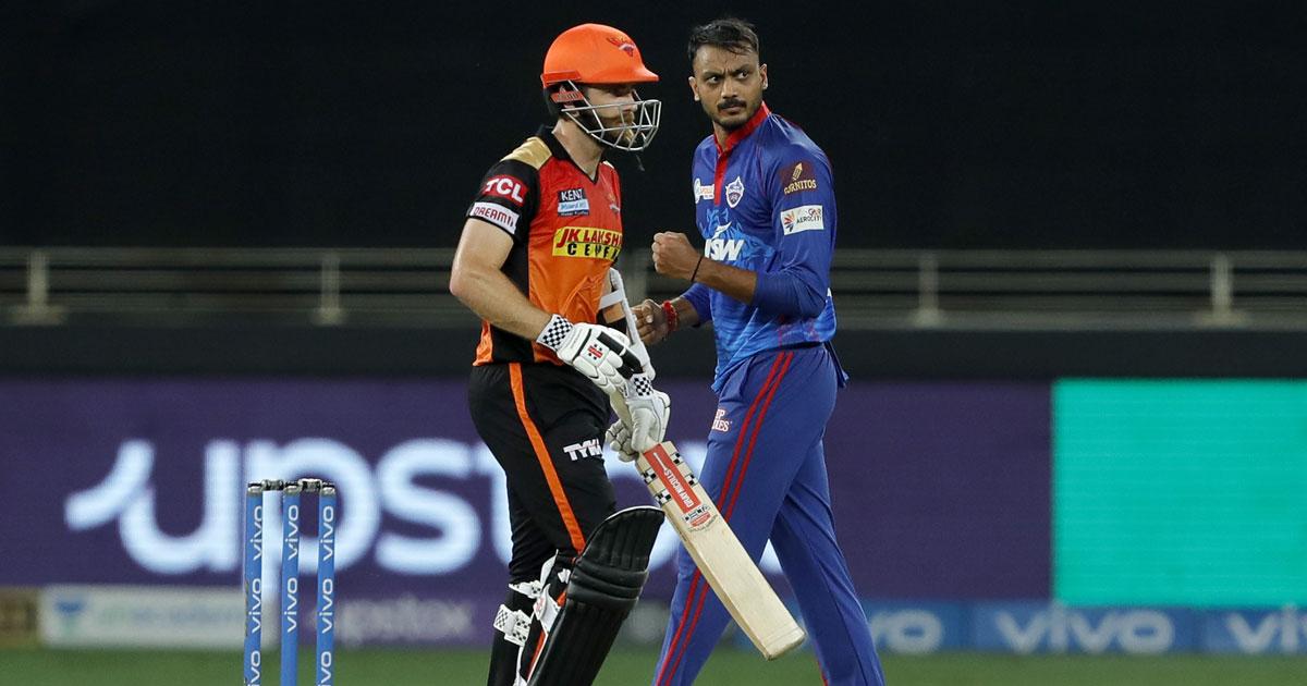 IMAGE: Delhi Capitals spinner Axar Patel celebrates Sunrisers Hyderabad Captain Kane Williamson's wicket. Photograph: BCCI