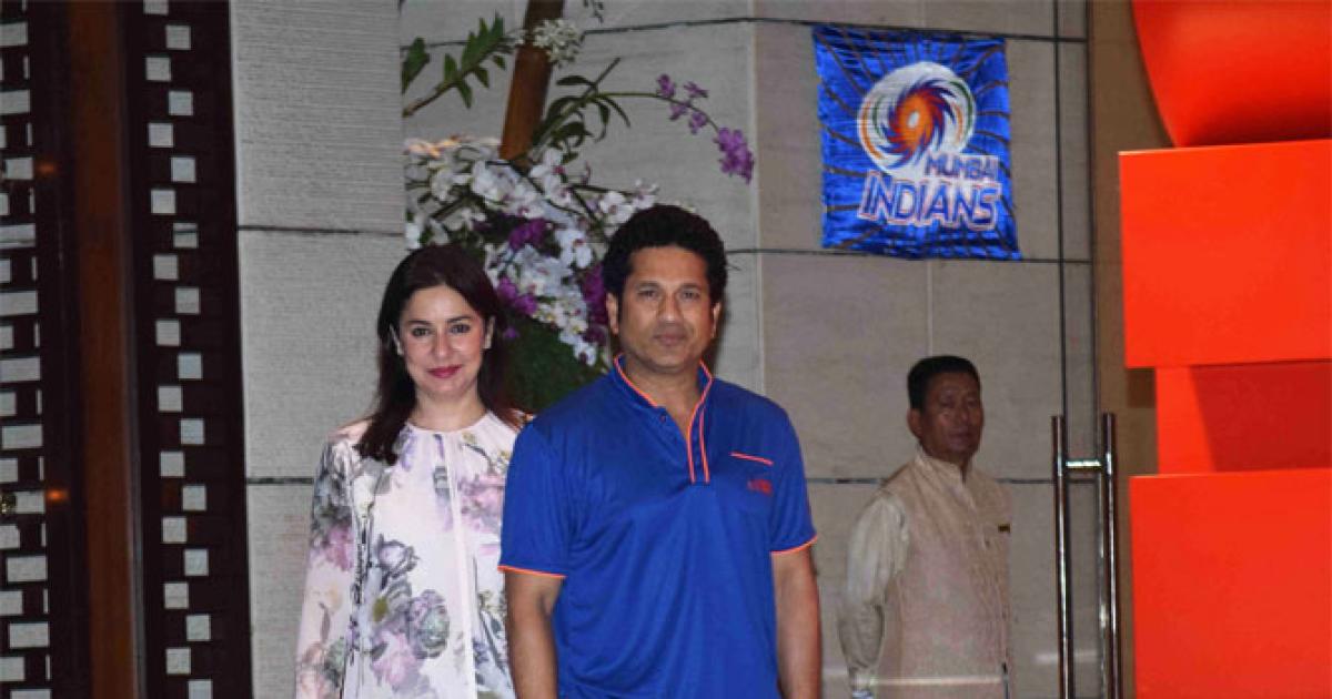 Mumbai Indians' team mentor Sachin Tendulkar and wife Anjali arrive for the party thrown by the team owners Mukesh and Nita Ambani, at a city hotel in Mumbai on Monday