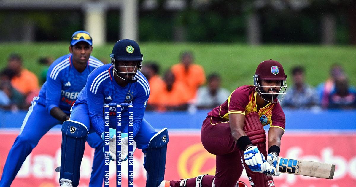 Yashasvi Jaiswal (5) started with a reverse sweep but Hosein's delivery that stopped and turned with a tad extra bounce forced the batter to offer a simple return catch.
