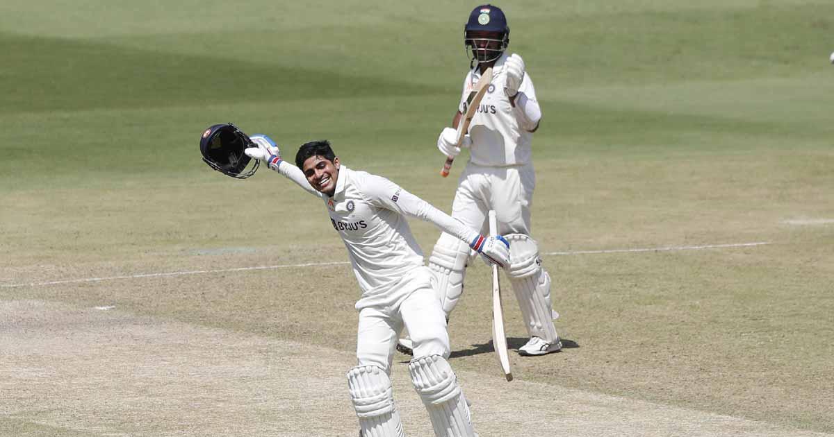 IMAGE: A delighted Shubman Gill celebrates his second Test century on Day 3. Photograph: BCCI