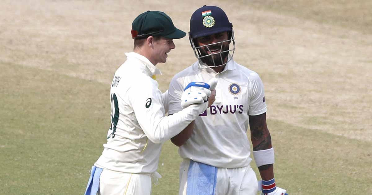 IMAGE: Virat Kohli speaks to Nathan Lyon. Photograph: BCCI