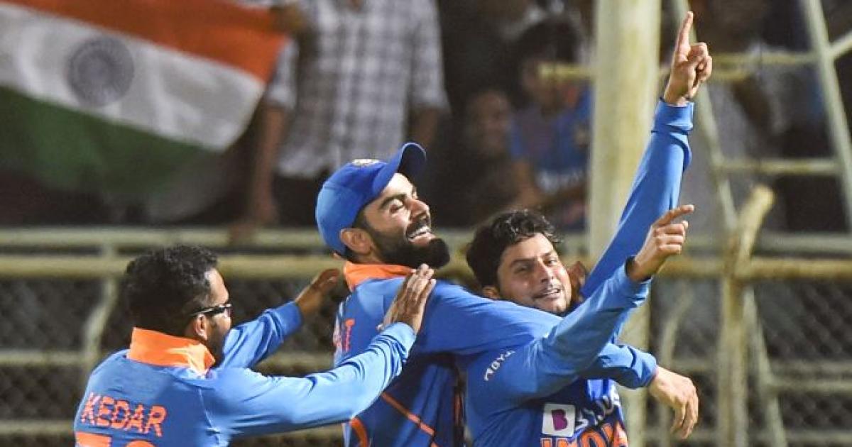 India's Kuldeep Yadav celebrates with skipper Virat Kohli and teammate Kedar Jadhav after completing his hat-trick during the 2nd ODI cricket against West Indies at ACA-VDCA Cricket Stadium in Visakhapatnam on Wednesday