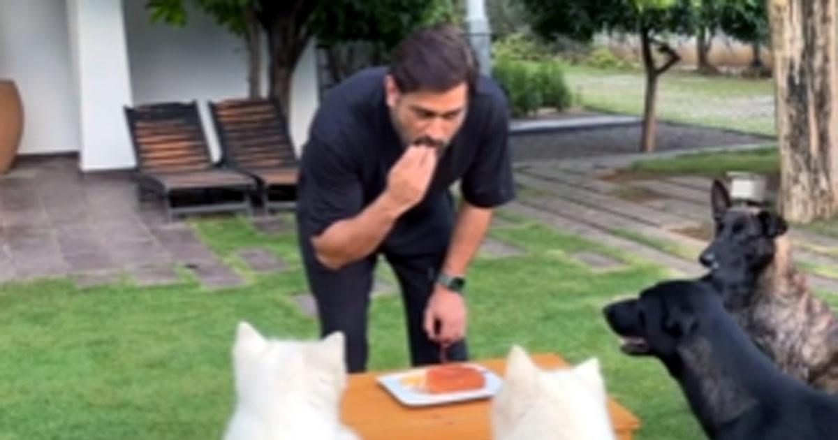 Dhoni, who turned 42 on July 7, cut a cake with his dogs, who seemed quite delighted with the attention.