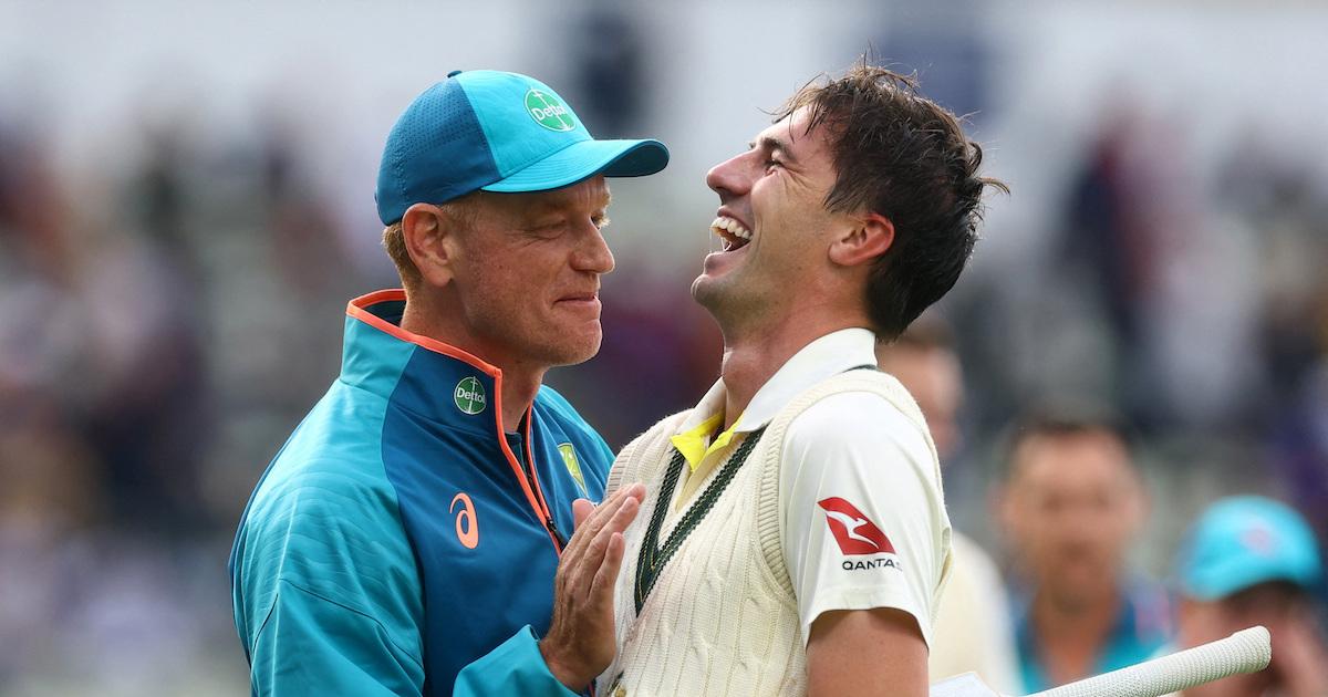 IMAGE: Australia Head Coach Andrew McDonald and Captain Pat Cummins celebrate the stunning win. Photograph: Paul Childs/Reuters
