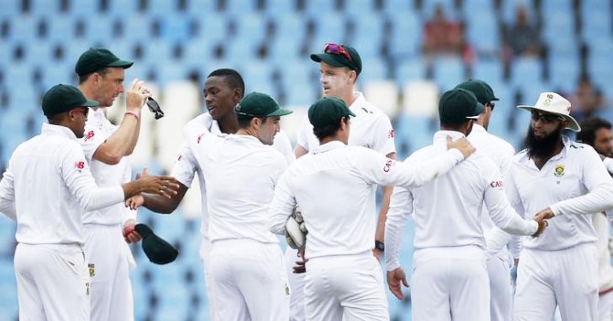 IMAGE: South Africa players celebrate during a Test match. Photograph: Siphiwe Sibeko/Reuters