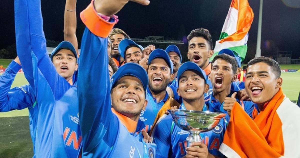 IMAGE: The Indian U-19 team celebrate their victory. Photograph: Cricket World Cup/ICC/Twitter