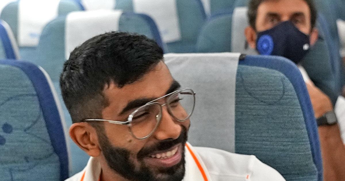 IMAGE: Jasprit Bumrah seems his usually upbeat self on the flight.