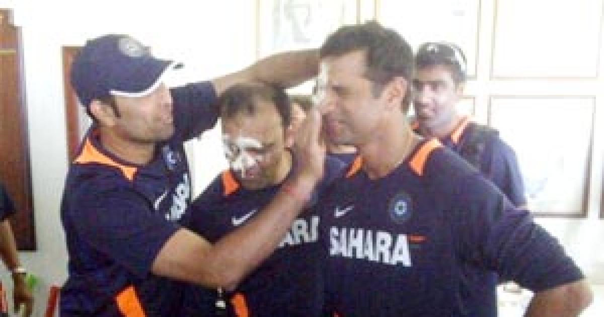 Left-arm spinner Pragyan Ojha tweeted a picture of VVS Laxman smearing Dravid's face with the birthday cake.