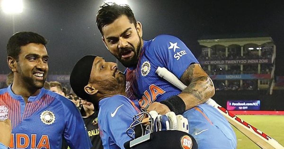 IMAGE: Harbhajan Singh lifts Virat Kohli after his match-winning knock against Australia at Mohali. Photograph: BCCI.