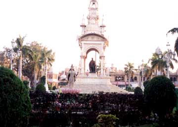 At the centre of Gwalior's main square stands a statue of the late Madhavrao's father, Jivajirao. The statue is surrounded by some stunning architectural work -- buildings that now house the town hall, a bank and a library. If you can't see the statue and the buildings in the picture, blame it on an aim-and-shoot camera handled by an amateur. |