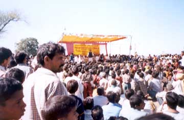 All of Scindia's meetings, like this one in a small village, were well attended. Villagers could be seen crying when he mentioned September 30 -- the day his father died. |