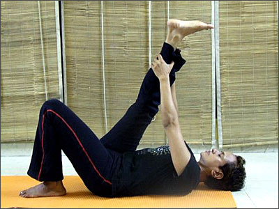 Lie on your back. Bend your knees, placing feet flat on the ground. Inhale. Raise your right leg up. Exhaling, place your hands around the shin. If that is not possible place your hands around your thighs. Hold for a few seconds.