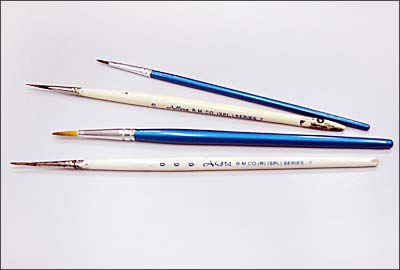 You can use regular watercolour brushes for glass painting. Small size brushes are ideal for filling in the colours, and sizes 000, 00, 0, 1 and 2 are recommended.