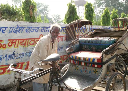 Image: Narayan Jaiswal, Govind's father, parks his rickhaws outside the Varanasi City railway station, which is close to his home.
