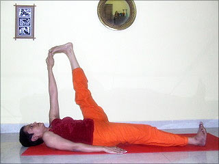 Lie on your back and inhale. Raise right hand. Simultaneously raise right leg up in the air. The raised leg must be at right angles to the body. Reach right hand to right foot, grasping the big toe. Hold for as long as you can, breathing normally. Initially, if you have stiff joints, you may not be able to hold the leg up straight. In which case, bend it slightly at the knee. If your hand cannot reach the foot, just place your hand wherever you can on the raised leg. Relax after a while. Repeat five times. Rest. Repeat entire sequence for the other leg.