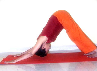 Get down on all fours like an animal. Inhale. Exhaling, lift off hips. Keeping the palms flat on the ground, push down both heels to stretch the legs completely. Push down at the shoulders so the head drops further down. While making all these adjustments, continue breathing normally. Hold for a few seconds. Relax back on all fours. Repeat thrice.