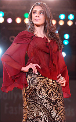 Here is a classy combination -- a striking black pencil skirt with gold print is teamed with a deep maroon blouse, complete with cascading sleeves.