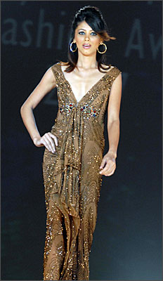 Seen here is a truly stunning dress, with low-cut neckline and shimmering work all over -- the perfect outfit for a red carpet event.