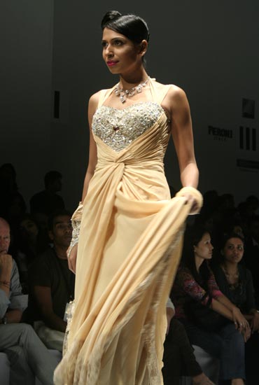 Large pearls swirled around the neck of the model as she strutted her stuff and gave the cameras a coy smile.