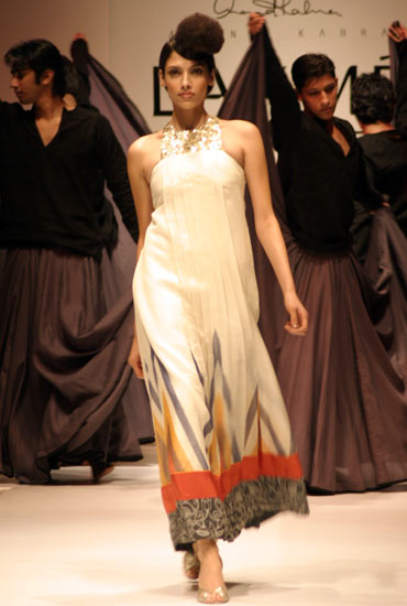 Anand Kabra's showing was a blend of ethnic and Western wear, with a few traces of Egyptian influences. Full-length gowns, dangerously short dresses, winsome saris and new-age churidar-kurtas all made an appearance.