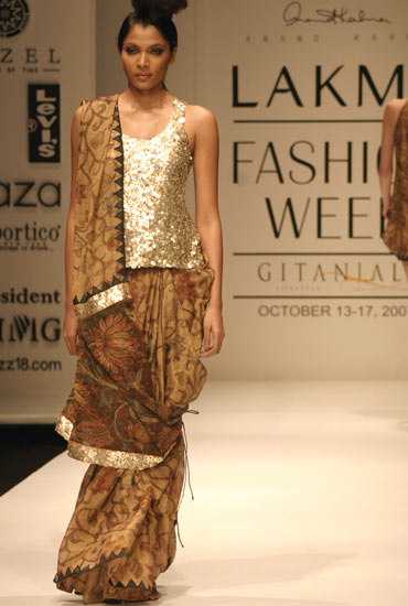 This sari was a definite highlight of Anand's show. He tried something different here, with the pallav wrapped around the front and tied up to the lower half. Although it's not quite sure what he intended, the ensemble was a beauty, with the heavy sequin-work on the choli making up for the subdued tones.