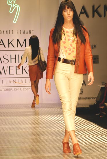 The majesty of the monsoon clouds was captured using metallic meshes and dark patent leather. One of the more subdued outfits, this one teamed ivory trousers with a tan leather jacket -- the cuts speak for themselves.