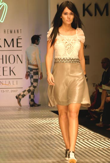 The transition from light daywear to evening and partywear was smooth and effortless with this delightful piece in ecru. The delicate crochet work on the top was feminine and sexy, while the satin chiffon skirt swished and swirled around the model's hips, giving the ensemble just the right touch of sensuality.