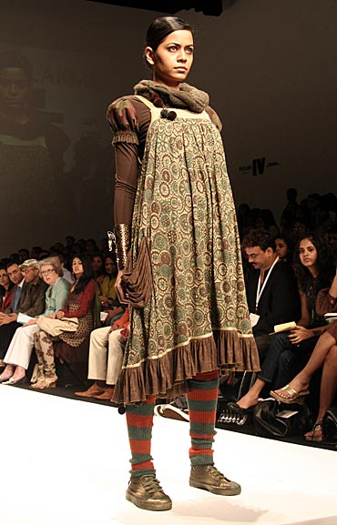 free-flowing pinnafore dress is worn over a puffed-sleeve shirt and teamed with colourful, striped leg-warmers.