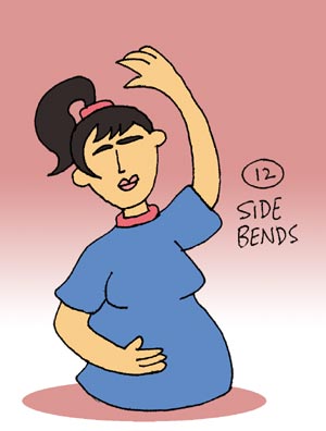 Sit or stand. Take your right arm overhead, left hand on the tummy and bend from your waist over to the left. Make sure your right hand doesn't come forwards. Come back to center, and then change sides. Feel a good stretch in the waist.