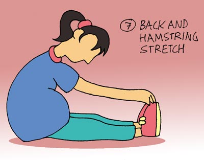 Sit on the floor with both legs extended straight out in front. Slowly reach for your toes. If you can't get the toes, try your ankles or calves. Lower your upper body towards the legs and feel a stretch in your back and back of the thighs. Hold for 10 seconds and repeat.