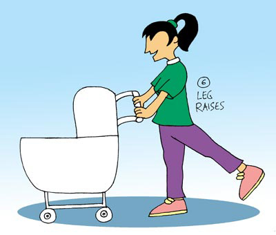 Still holding onto the handle bar of the pram, raise your leg to the side as high as possible, squeezing the outer thigh. Don't swing but use muscle control to make the move. Gently lower. Do 10-12 reps with each leg.