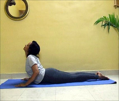 Lie on your stomach with chin on the floor and palms on either side of your shoulders. Inhale. Raise chin and shoulder off the floor arching back. Eyes should look up at the ceiling, stomach should remain pressed on the floor so the arch is emphasised at the lower back.