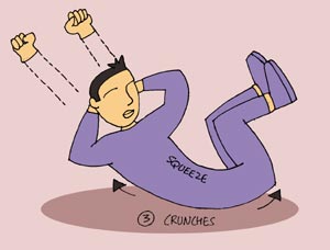 Simultaneously, lift your upper body till the shoulder blades come off the floor and raise your hips lifting them off the floor, drawing your knees towards the chest. Squeeze the whole abdominal muscle hard, pressing the navel down to the spine.