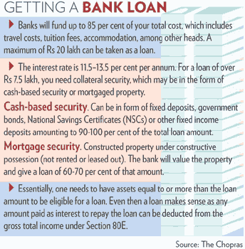 While loans up to Rs 20 lakh are available, collateral is needed for loans above Rs 7.50 lakh. Maheswari got a Rs 20-lakh loan from Allahabad Bank for his Bachelor's course. He, however, had the advantage that his father was with the bank for the previous 30 years. (see Getting A Bank Loan)