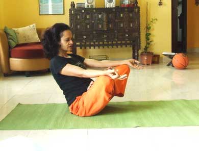 Sit in the padmasana. Tilt back lightly, so knees lift off the ground. The thighs must apply a slight pressure on your stomach if the knees are raised high. Initially you may use a back-rest, like a solid chair or a wall, behind you, till you gain confidence at holding your balance.