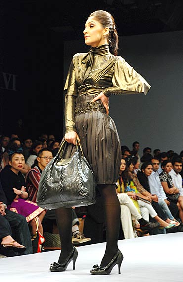 Seen here is a classic ensemble from Mandira Wirk, which is metallic from top to toe -- but then her whole collection was inspired by Metallic Luxe!